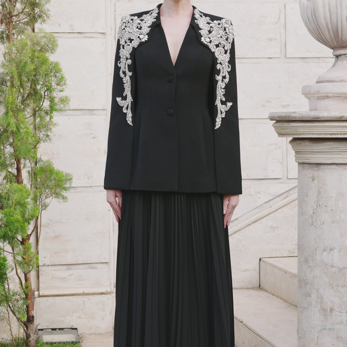 Collarless 3D Crystal-Embellished Blazer With Gathered Skirt Set