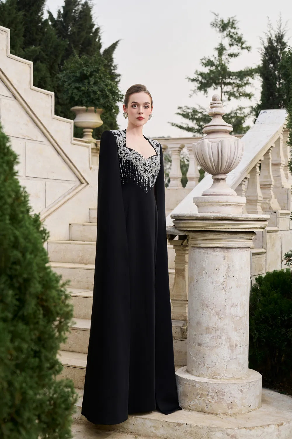 Long Flowy Sleeves Cape Crystal-Embellished Dress