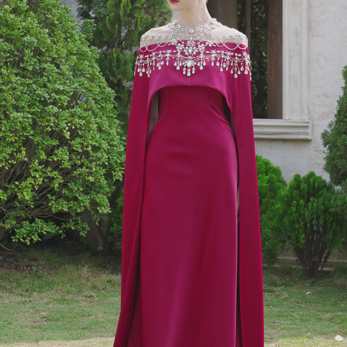 Crystal-Embellished See-Through Shoulder Long Flap Dress